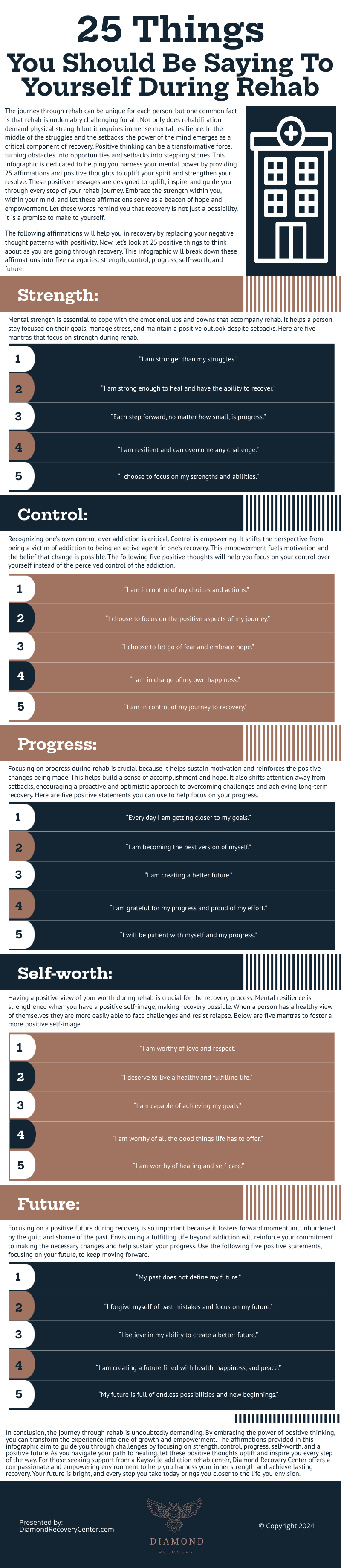 This infographic presents 25 affirmations and positive thoughts to uplift and inspire your spirit, guiding you through each stage of your rehab journey.