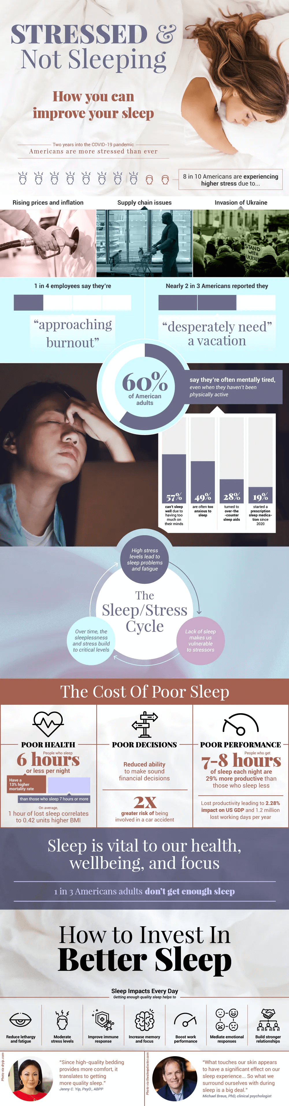 Many of us are stressed and not sleeping, and continue to reinforce this negative pattern, day after day. The pandemic has taken its toll on us all, mentally and physically, so we would all do well with a healthy reset of better sleep routines and patterns. It’s time to break the chain of poor sleep – investing in better sleep is key.